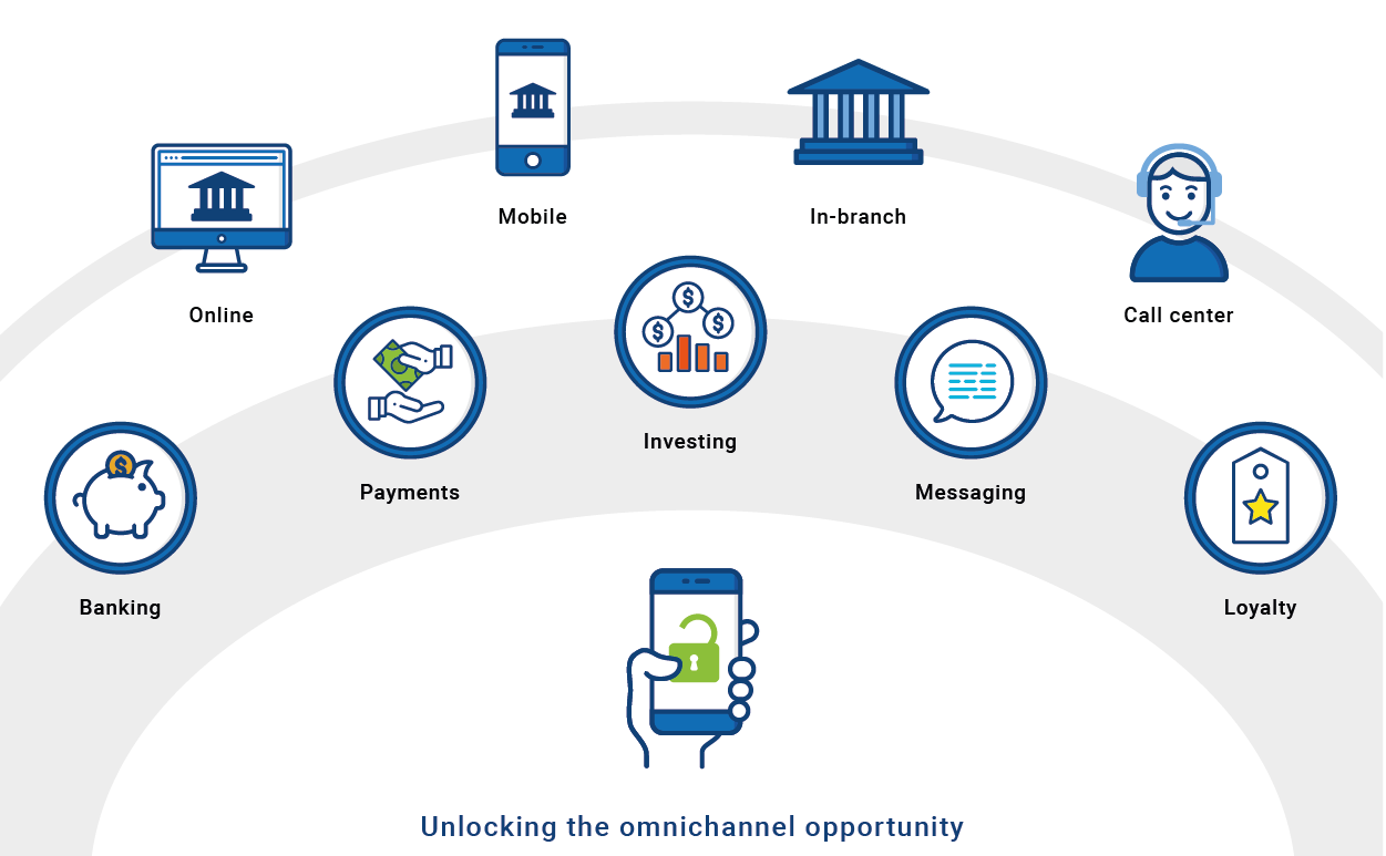 Trong ngân hàng và dịch vụ tài chính, mô hình omnichannel giúp kết nối các kênh như chi nhánh, điện thoại, SMS/MMS, mạng xã hội, ứng dụng mobile… để khách hàng có thể chuyển từ kênh này sang kênh khác mà không phải kể lại câu chuyện.